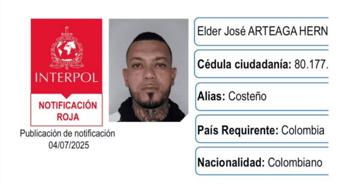 Élder José Arteaga Hernández, alias ‘el Costeño’, fue incluido en la lista de los criminales más buscados del mundo, tras la emisión de una circular roja por parte de Interpol.