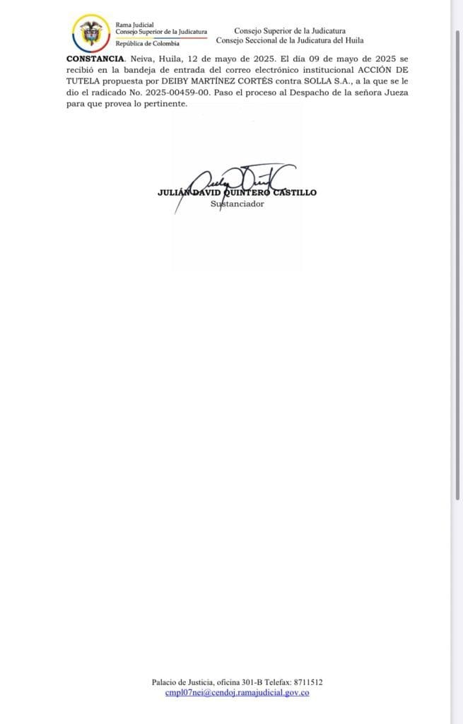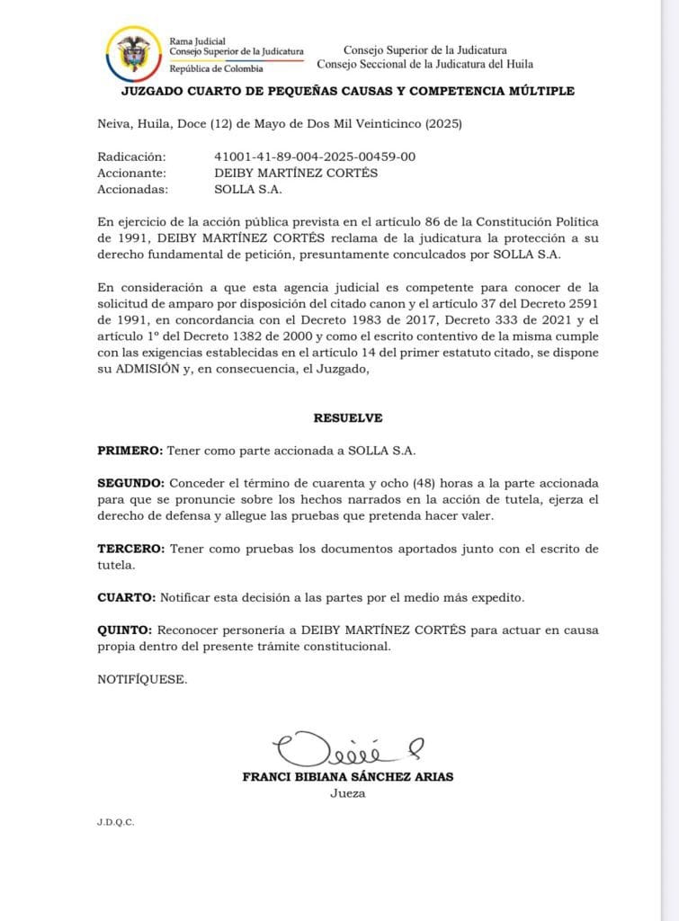 Y frente a ese silencio corporativo, Deiby Martínez arrincona a SOLLA S.A.: cuatro tutelas admitidas y la empresa sigue actuando como si estuviera por encima de la ley y de los jueces. ¿Hasta cuándo?