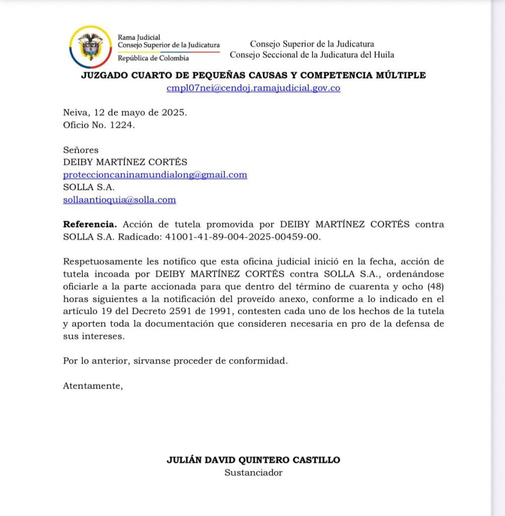 Esta vez, Deiby Martínez logra que cuarto juez le dé la razón y deja en evidencia a SOLLA S.A., que sigue ocultando qué le dan de comer a nuestros perros. El expediente, radicado bajo el número 41001-41-89-004-2025-00459-00, expone cómo la empresa volvió a negarse a responder preguntas clave sobre la inocuidad, trazabilidad, calidad sanitaria y controles microbiológicos de los alimentos que produce y comercializa masivamente en Colombia.