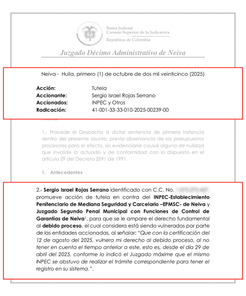 El Juzgado Décimo Administrativo de Neiva concluyó que el Inpec vulneró el derecho fundamental al debido proceso del procesado al no registrar oportunamente el inicio de su detención, decretada el 28 de abril de 2025. El organismo solo formalizó la medida hasta el 12 de agosto, pese a que existían múltiples solicitudes y advertencias de la defensa.